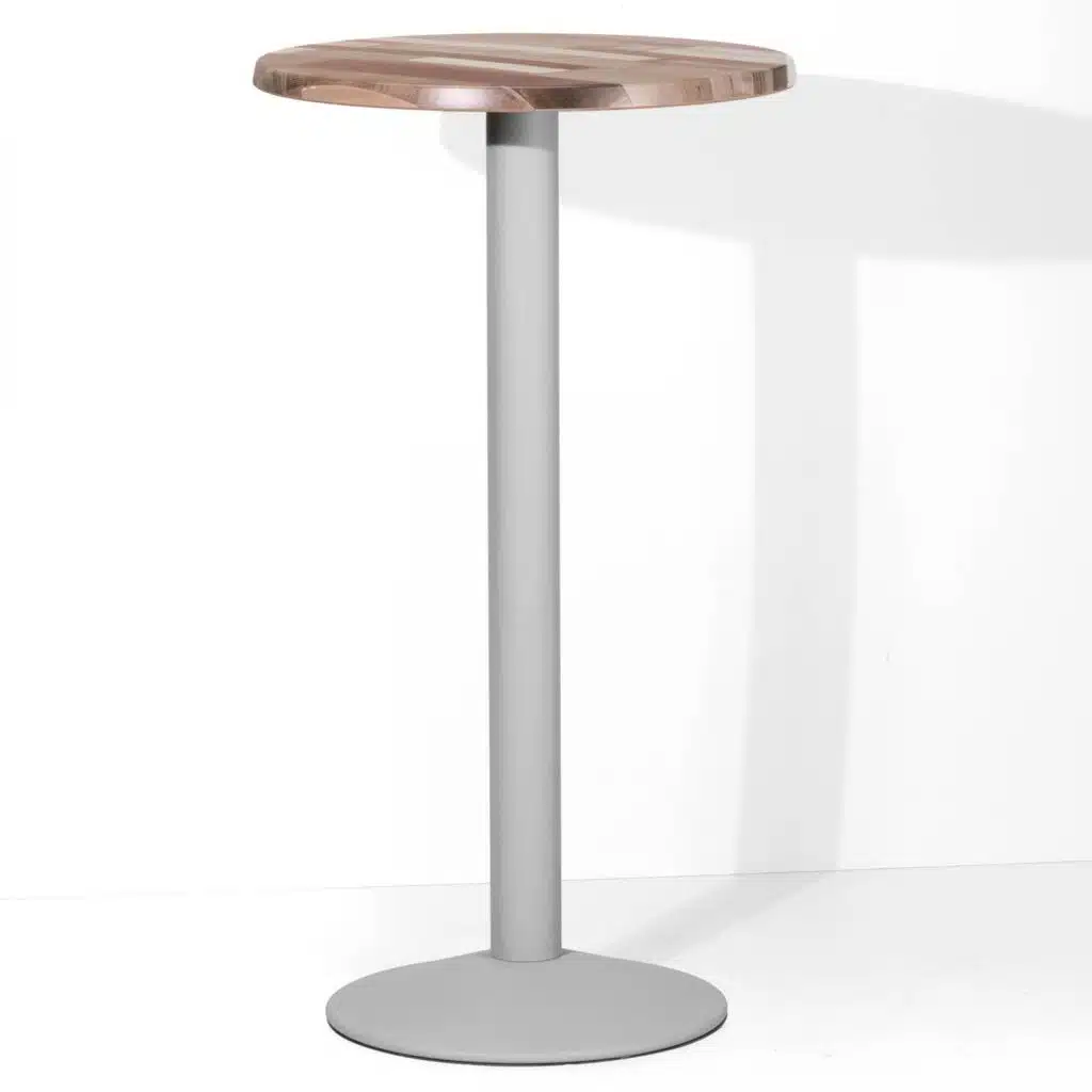 Disponibile in 28 colori e piani di alta qualità (Werzalit, HPL, Nobilitati), la base ha un diametro di 46 cm che garantisce la stabilità.