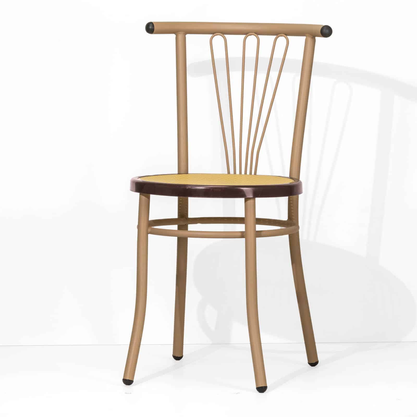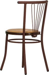 Lo schienale della sedia Jessica presenta tre inserti in tondino metallico curvato, disposti a raggiera, che conferiscono alla sedia un carattere distintivo e raffinato.