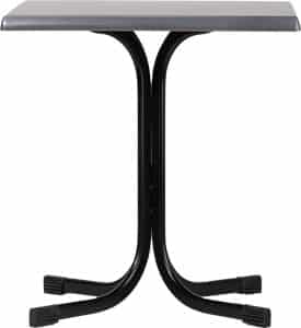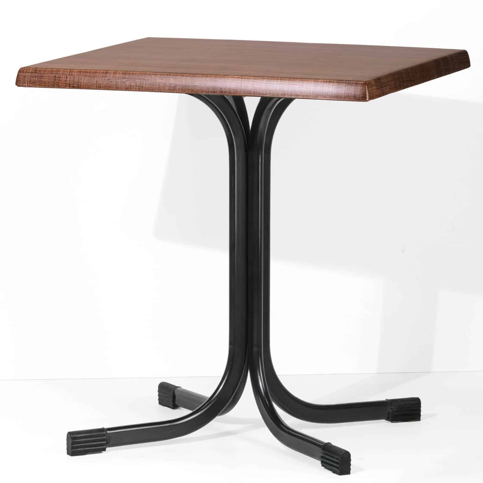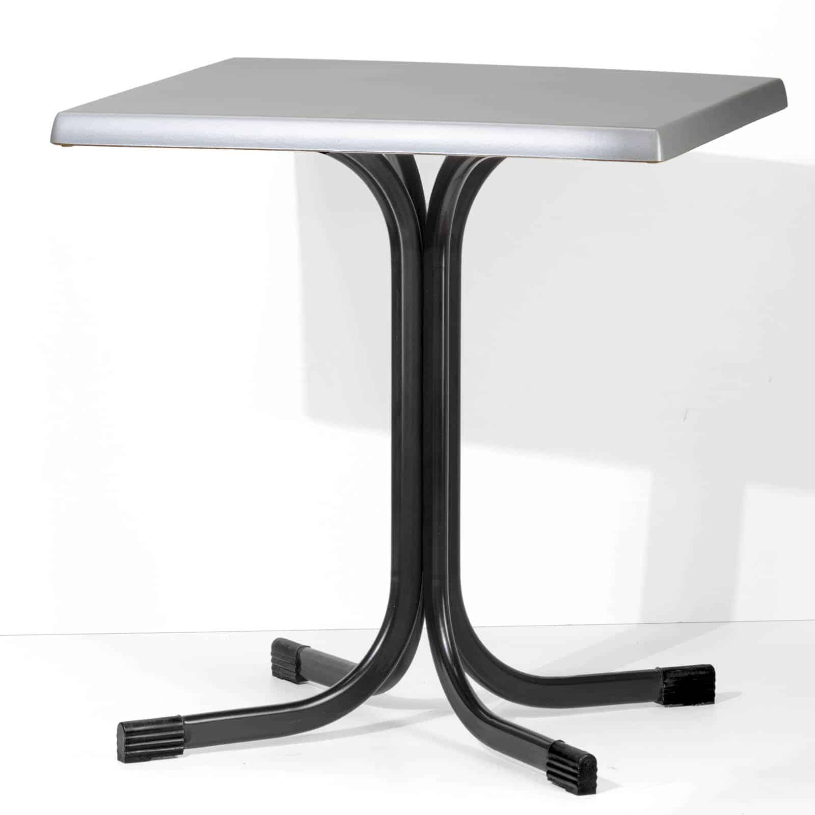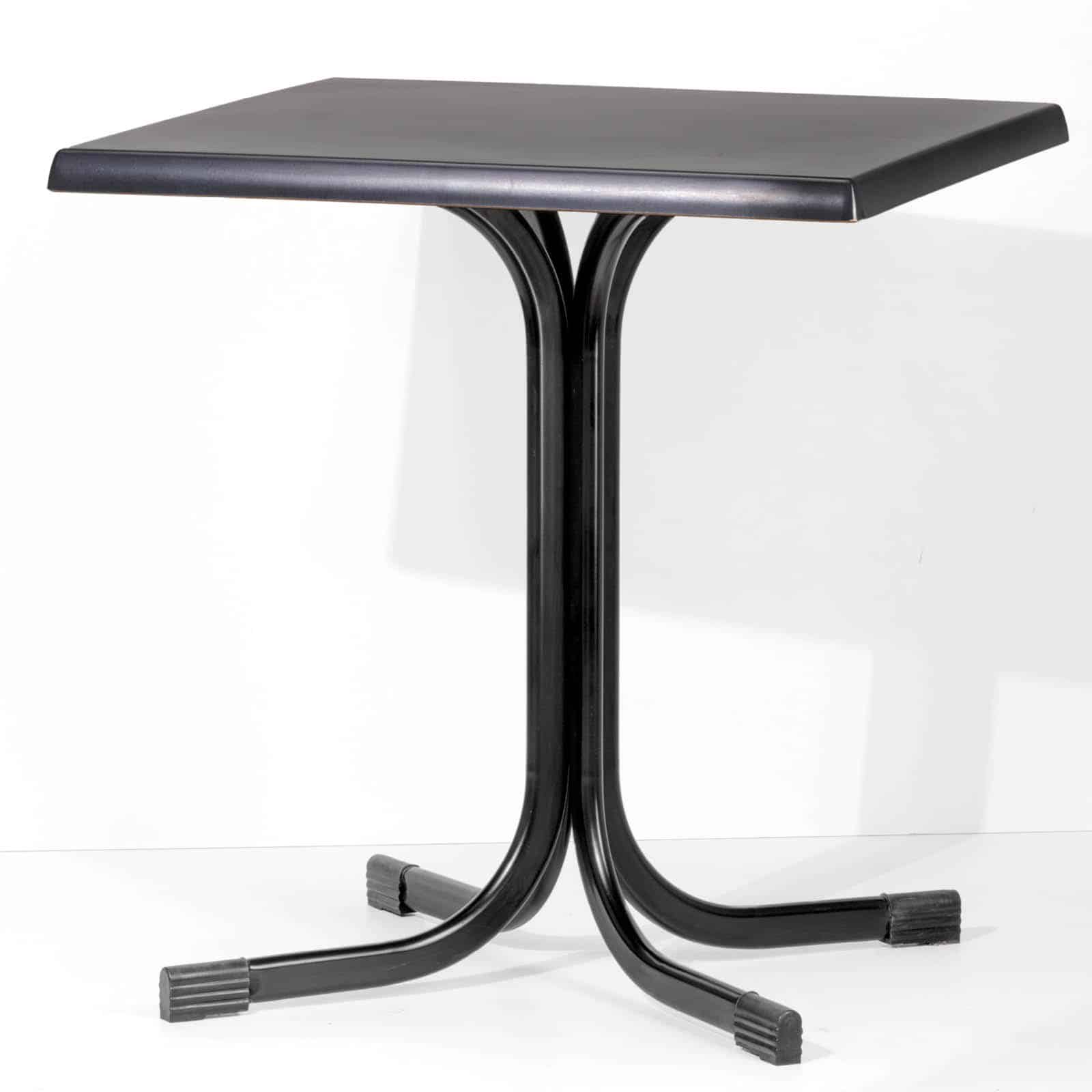Le gambe sono piegate nella parte superiore, creando un supporto a croce con 4 fori asolati per il fissaggio dei piani. I piani disponibili in Werzalit, HPL e Nobilitati, arrivano alla misura di 80×80 cm, perfetti per ospitare comodamente fino a quattro persone.