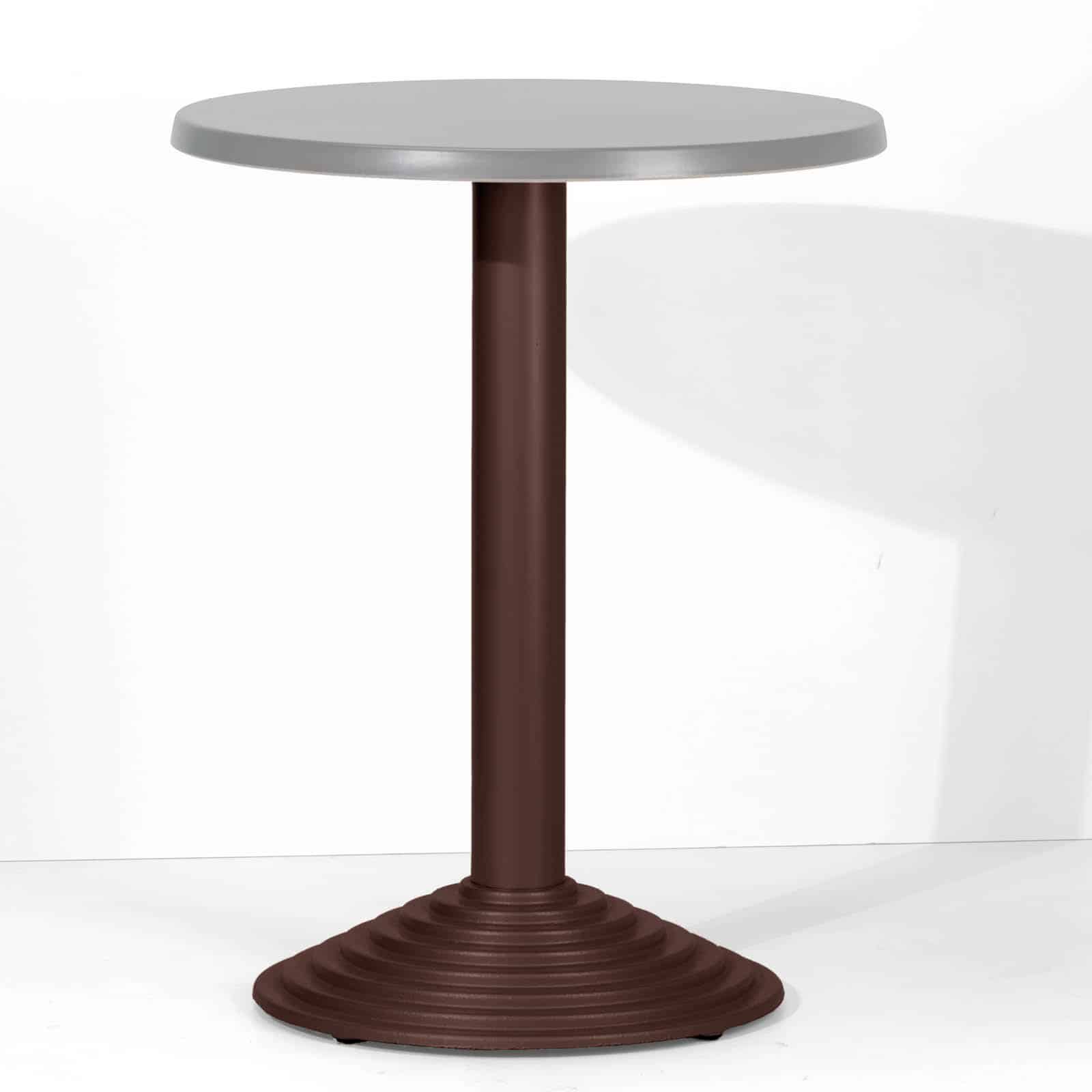La base è disponibile in 28 colorazioni diverse, mentre i piani sono realizzati in materiali di alta qualità come Werzalit, HPL e Nobilitati e possono raggiungere una dimensione massima di diametro 80 cm.
