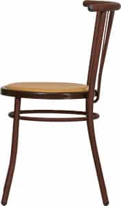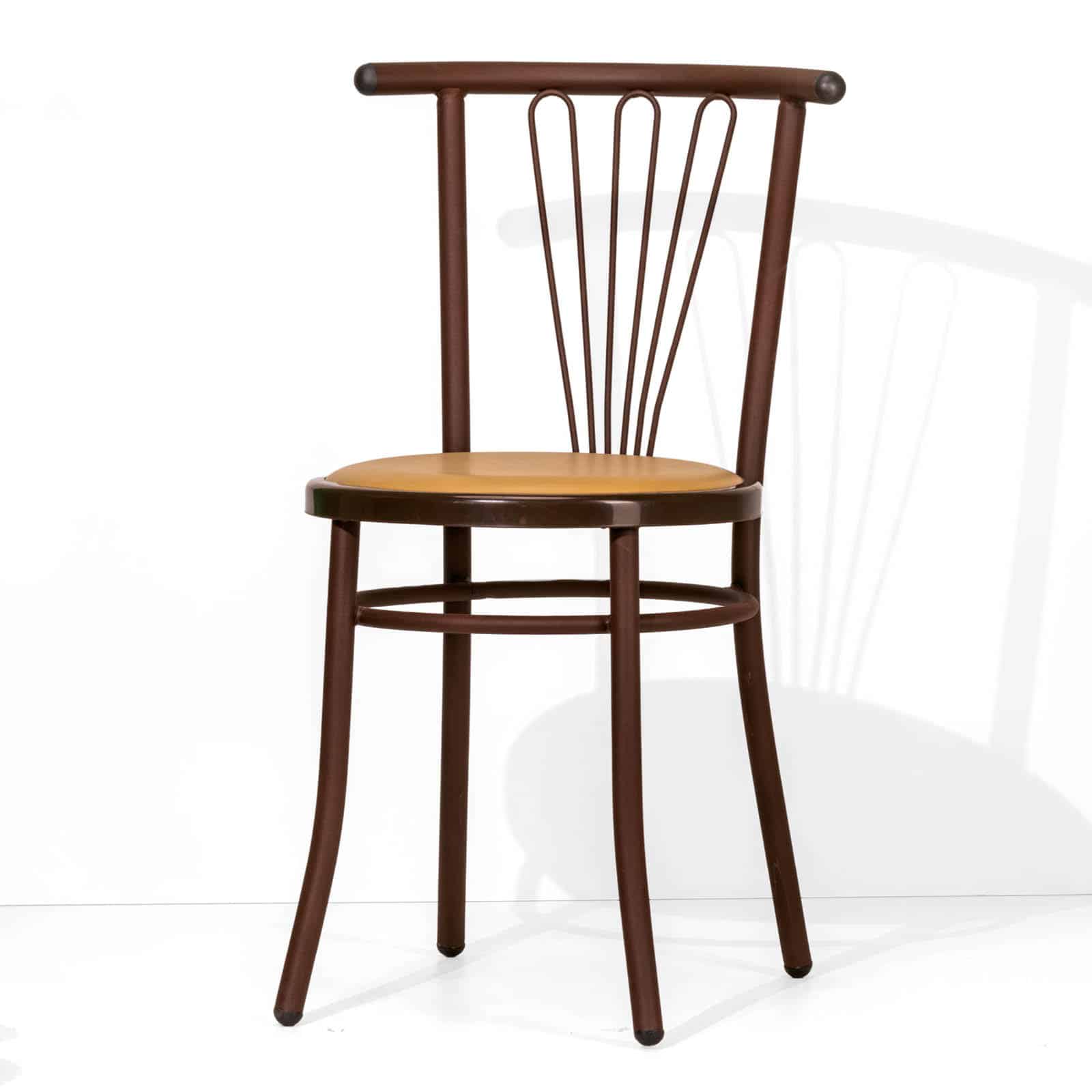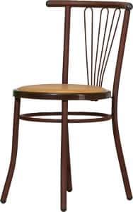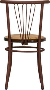 Lo schienale della sedia Jessica presenta tre inserti in tondino metallico curvato, disposti a raggiera, che conferiscono alla sedia un carattere distintivo e raffinato.