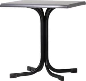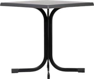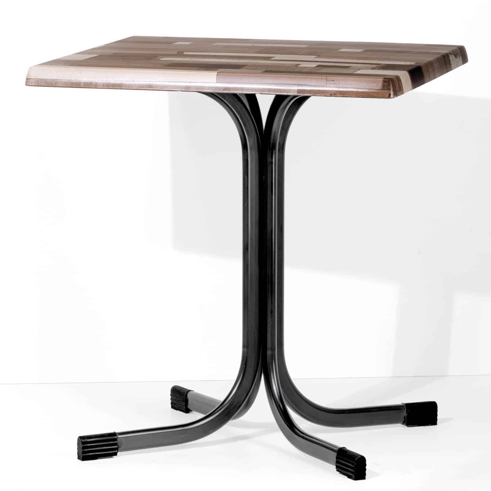 Le gambe sono piegate nella parte superiore, creando un supporto a croce con 4 fori asolati per il fissaggio dei piani. I piani disponibili in Werzalit, HPL e Nobilitati, arrivano alla misura di 80×80 cm, perfetti per ospitare comodamente fino a quattro persone.
